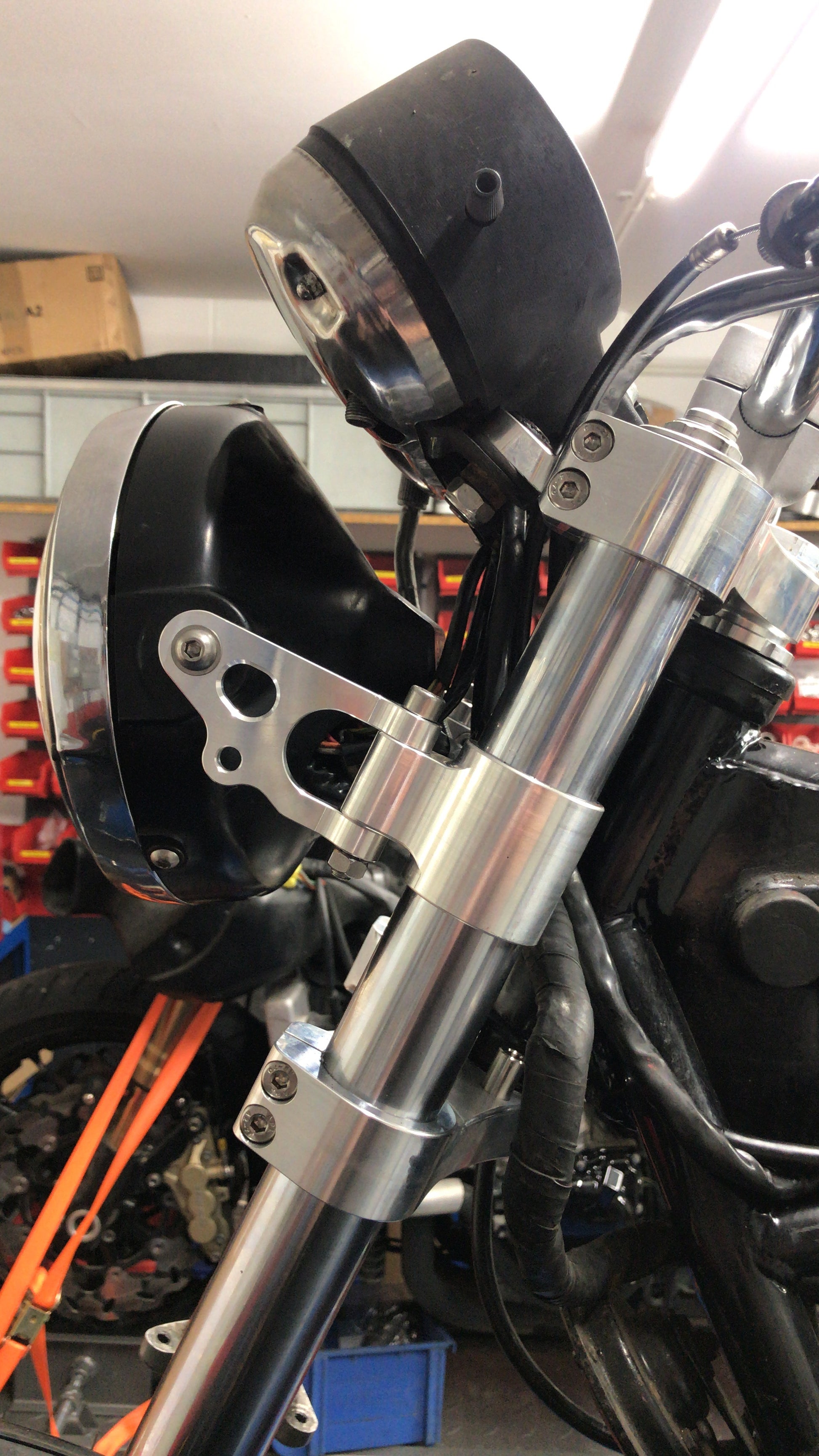 Yoke set design for the GS750 front fork conversion to Bandit 1200 MK1 forks (43mm), this Yoke set have been manufactured as a replacement for the standard yoke set and designed for the GS clocks to fit directly on to the top yoke. It has stops and an offset (45mm) replicating that of the GS750 we can however, manufacture to suit other GS models that use the same clocks.
